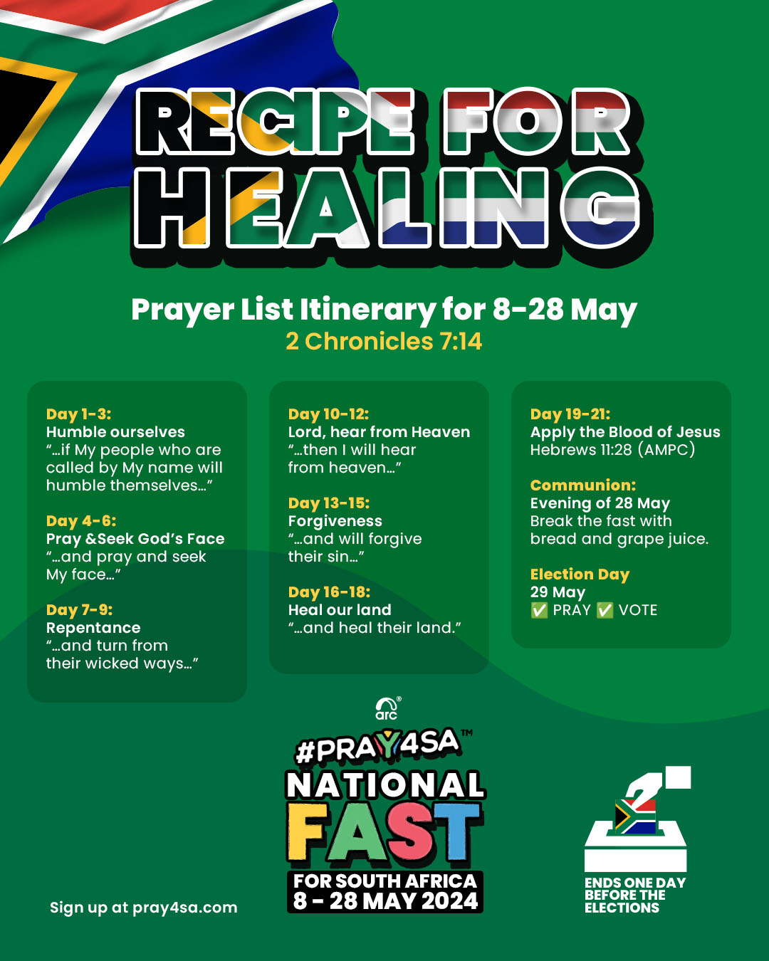 Save the Prayer List Itinerary for the 21 days of united fasting and prayer that starts on 8 May. Join us as we follow the recipe for healing our land in 2 Chronicles 7:14.